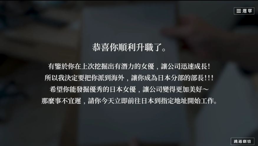 《这个面试有点硬》玩家不再是菜鸟面试官,成功面试 66 位女模的你,已经脱胎换骨,收到老板的任务,出发日本,却遇到了邪恶组织“M”!